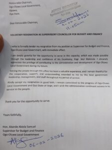 In a formal resignation letter addressed to the Chairman of Ogo Oluwa Local Government, Hon. Akande expressed appreciation for the opportunity to serve, describing his tenure as a valuable experience in public service.