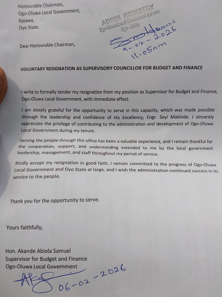 In a formal resignation letter addressed to the Chairman of Ogo Oluwa Local Government, Hon. Akande expressed appreciation for the opportunity to serve, describing his tenure as a valuable experience in public service.